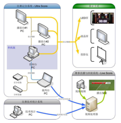 體育館兩邊安裝兩塊LED顯示屏,兩塊屏后的控制室內(nèi)分別設(shè)立控制電腦,負責大屏的控制和顯示,大屏通過LED數(shù)據(jù)和控制電腦相連。場館內(nèi)設(shè)立局域網(wǎng),兩臺LED顯示屏控制電腦都連入網(wǎng)絡(luò),同時比賽期間放于場邊的裁判操作電腦連入局域網(wǎng),該電腦與籃球打分控制器相連接,比賽時裁判只需要在場邊進行打分。兩塊大屏可同時顯示相同信息,也可以各自分別顯示不同的內(nèi)容。兩邊的籃球架上都安裝籃球24秒專用顯示屏,并用數(shù)據(jù)線連接到場邊的24秒控制臺上,比賽中可由專人負責進行比賽和24秒計時操作。24秒控制臺與場邊的裁判控制電腦可以使用數(shù)據(jù)線連接,則也可以使用軟件來控制24秒計時的顯示同時在場邊配置了一套籃球?qū)S玫姆敢?guī)顯示器(單面顯示),用于顯示賽隊犯規(guī)次數(shù)。 一套籃球?qū)S们驒?quán)控制器(單面顯示),指示當前控球權(quán)的一方。在單獨的一臺電腦上安裝籃球比賽用軟件,用于統(tǒng)計賽程中球員的賽場表現(xiàn)情況。比分直播系統(tǒng)通過與體育場館比賽計分系統(tǒng)、籃球技術(shù)統(tǒng)計軟件進行通訊,在采集多路現(xiàn)場視頻信號的同時,對信號進行本地化的快速編輯處理,實現(xiàn)現(xiàn)場實時比分疊加、球員信息顯等視頻播放要求。賽場的多媒體綜合信息發(fā)布系統(tǒng),與賽場計時記分系統(tǒng)聯(lián)動,用于在賽場周邊的屏幕上統(tǒng)一管理和發(fā)布球場相關(guān)的球賽得分信息、球員及裁判信息、廣告以及相關(guān)資訊、指引等。