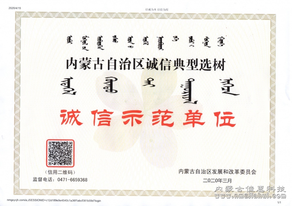 近日,根據內蒙古自治區(qū)、呼和浩特市兩級發(fā)改委關于誠信典型選樹的工作安排,呼和浩特經濟技術開發(fā)區(qū)發(fā)展改革和經濟促進局組織轄區(qū)內各類企業(yè)在“信用中國(內蒙古呼和浩特)網站”和“內蒙古信用促進網”申報誠信示范典型材料。經自治區(qū)信用主管部門嚴格的初審、復審,內蒙古佳惠科技有限公司被選樹為2020年度誠信示范單位。